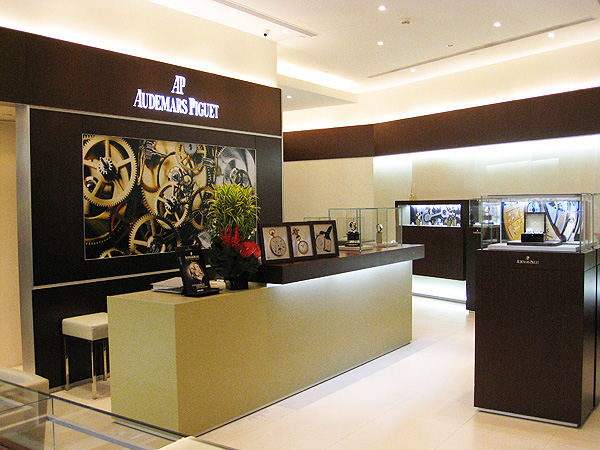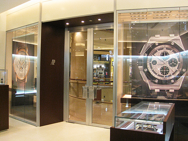 進入到專賣店中,可以感受到明亮的燈光與原木裝飾所帶來的舒適質感,而店內的展示空間,如同一個L字型的空間。而中間牆壁上的輪系零件圖片,可以發現AP機芯的打磨技術,的確毫不馬虎。