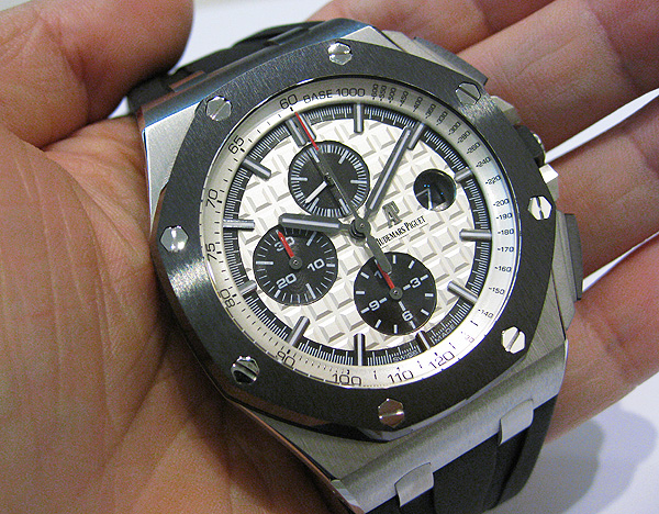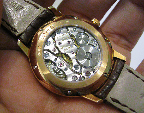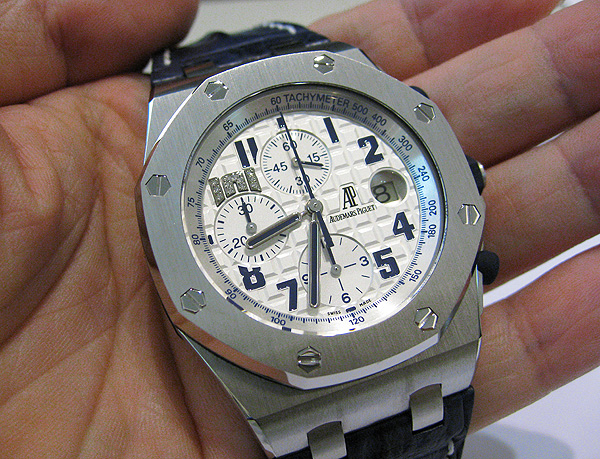 這是今年AP推出的女皇盃2011皇家橡樹限量版腕錶,使用自製的3120自動機芯,以及18K白金材質,限量100只。從錶款正面來看,與一般大三針的款式沒有什麼差異,所以需要由別的地方來判定。