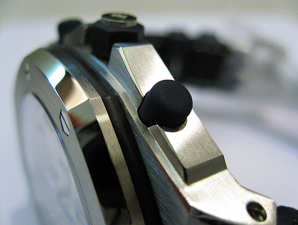ROO的42mm計時錶款,都採用圓形計時按把,並同時包覆上橡膠材質,而錶冠的表面也使用橡膠材質。位於錶圈下方的黑色橡膠圈,是提供防水的重要零件,由於錶殼的結構特殊,防水膠圈與一般錶款大不相同。