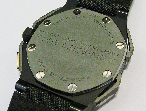 錶款的底蓋也是採用鈦金屬製作,上方有鐫刻“Royal Oak Offshore Arnold Schwarzenegger The Legacy”的字樣。