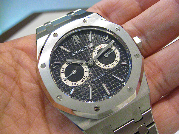 這一款則是皇家橡樹星期日期自動腕錶,左右兩個小錶圈,分別標示著星期與日期功能,是一款相當實用的日常生活用錶。