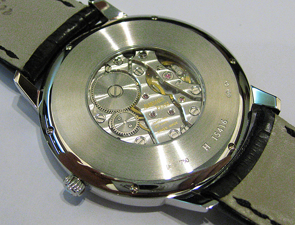 轉到錶款背面,可以發現內部搭載愛彼自製的Cal.3091手上鍊機芯,由於沒有小秒針設計,所以型號與先前的Cal.3090不同,但都是屬於同一顆機芯。機芯的厚度2.8mm,直徑為20.80mm,具有21顆紅寶石軸承。