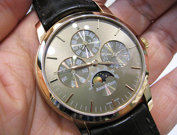 最近AP專賣店調整對外展示櫃的佈置,主要是為了今年的主打商品Royal Oak Offshore皇家橡樹離岸型計時碼錶44mm,以及旗下經典的Jules Audemars超薄萬年曆錶款。右邊的展示櫃中,則有展示這一款超薄萬年曆腕錶。