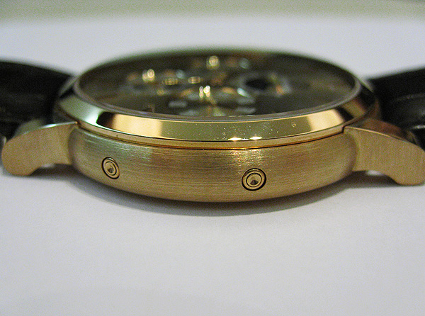 由於機芯的厚度僅有4mm,所以錶殼的厚度能控制在非常輕薄的狀態。在錶殼左側有兩個隱藏式快調按鍵,另外右側也有兩個。