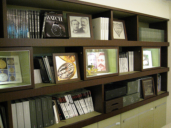 而貴賓室後方則是一個大型書櫃,裡面放置有廠方精美的型錄以及相關的歷史專書,另外還有國內專業鐘錶雜誌的書籍資料。