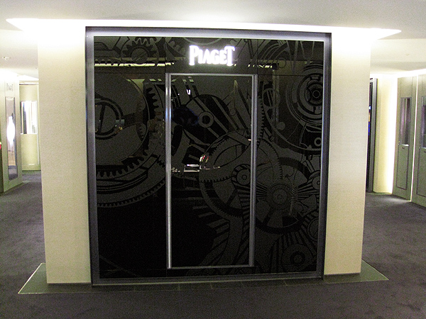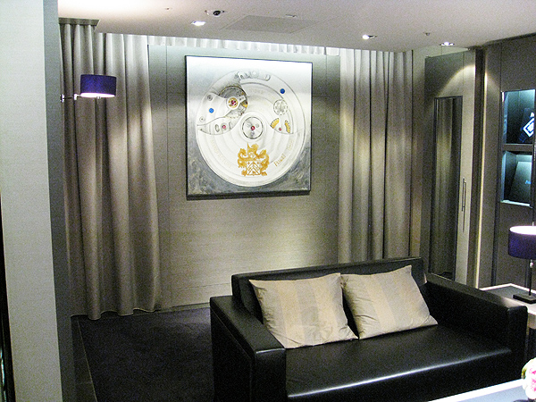 這是VIP室前方的展示牆,牆的前方是展示櫃,而後方黑色玻璃牆板具有特殊的機芯結構圖,與VIP室的白色半透明玻璃門上的機芯結構圖相呼應。