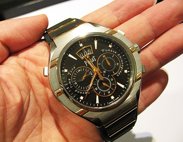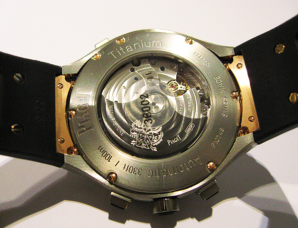 這是新款的Polo Fortyfive計時碼錶,使用鈦金屬與18K玫瑰金材質,整體配色明顯貴氣許多;錶款具有飛返計時功能與兩地時間顯示。