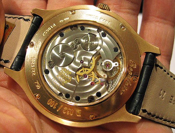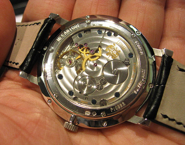 從透明底蓋上,我們可以看見這一款1208P超薄自動機芯,其厚度僅有2.35mm,是目前錶界最薄的自動上鍊機芯。而其直徑為29.9mm,震頻為每小時21,600次,具有40小時的動力儲存。