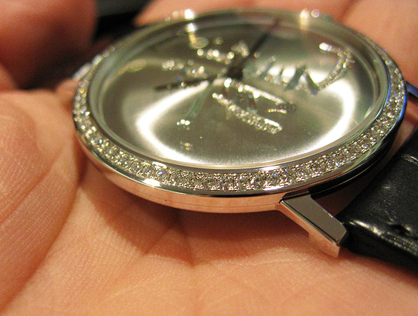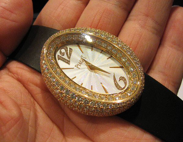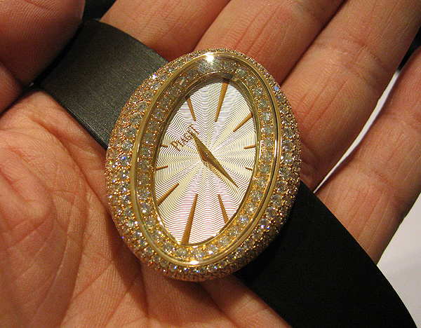 這是先前伯爵所推出的Limelight Magic Hour女錶,外型為特殊的橢圓形設計;本款是華麗的全鑲鑽款式,連12點與6點的時標上,也有鑲嵌鑽石。本款腕錶還有一項最特別之處,那就是…….請看下一張圖片。