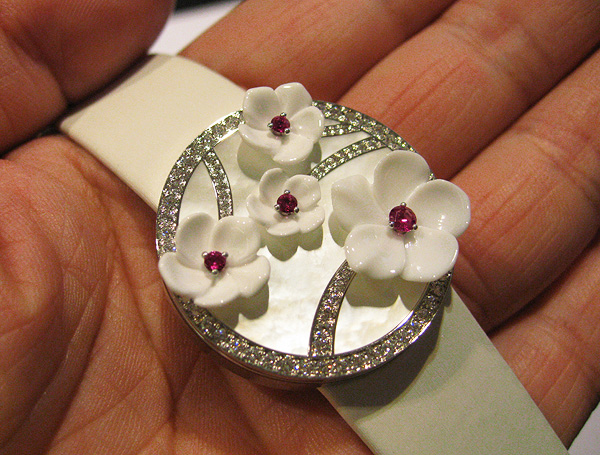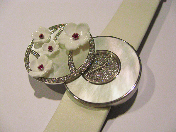 方法很簡單,只要輕輕的推開櫻花點綴的錶蓋,鋪鑲鑽石的珍珠母貝的面盤便映入眼簾;錶款的整體設計非常有創意。