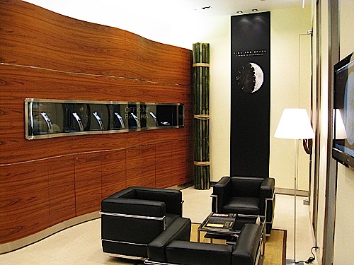進入店內之後,會發現到有波浪造型的展示櫃,中間的玻璃內,分別展示腕錶與特製的儀器。而門口有一大束的竹子,品牌人員說,這樣的設計可替店內帶來綠意。