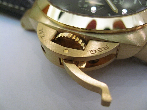 玫瑰金材質的錶冠護肩與拉桿,隨著金價持續高漲,小編覺得沛納海的貴金屬錶殼很有價值,很實在。