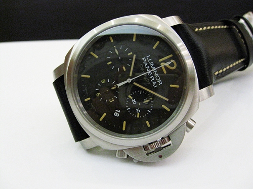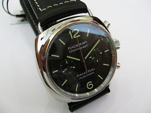 PAM00369,Radiomir Chronograph-42mm。夜光功能非常敏銳,小編只不過將錶款立起來拍攝,指針與時標就發出微微的綠光,相信錶款在黑暗處會更加明亮。