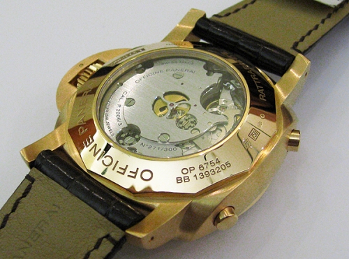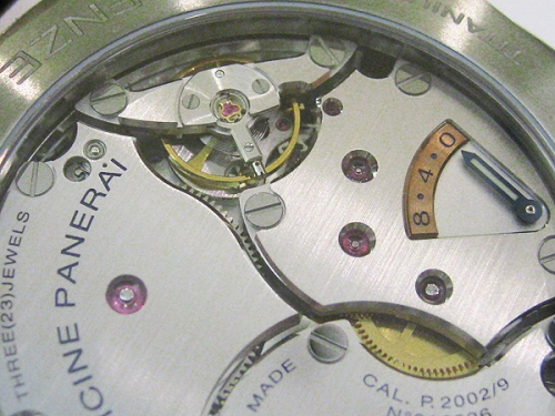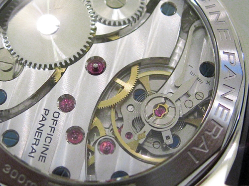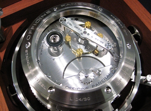 使用沛納海特別修改過的ETA 6497機芯,型號為OP X手上鍊機芯,儲能56小時,具有鵝頸式微調裝置,機芯修飾的非常精美。