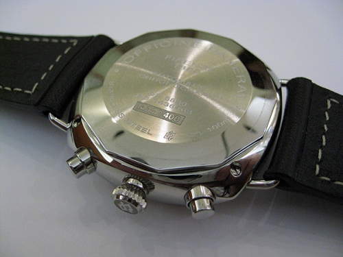採用P.2006/3八日手上鍊雙追針計時機芯,由於機芯厚達9.6mm,因此錶殼十分厚重。