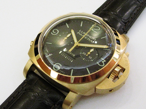 PAM00319,Luminor 1950 Chrono Monopulsante 8 Days Oro Rosa – 44mm ,機芯型號為P.2004/6。這款腕錶與沛納海大部分的自製計時錶款不同,主要是減少了GMT功能,同時將直線水平的動力儲存顯示功能改為五分之三圓的指示設計,限量150只。