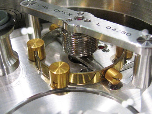 採用OP XX 型手上鏈機械機芯,本款機芯通過天文台認證,使用圓桶型游絲與螺絲補償擺輪,精準度極佳。