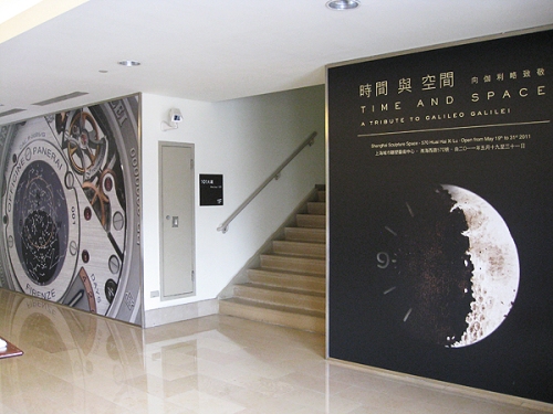 展示櫃上的錶款,搭配[時間與空間,向伽利略致敬]的展示背景。