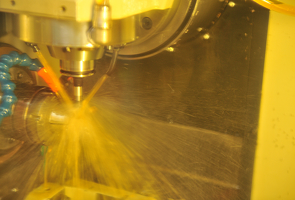 這是正在進行切割步驟的CNC電腦加工母機,在切割的過程中,噴出的切削油,能提供潤滑與降溫的功能。