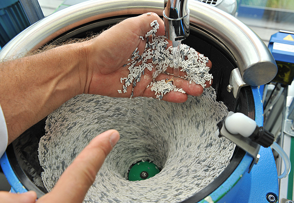 由於零件切割完畢之後,表面仍相當粗糙且銳利。因此透過自動攪拌機,以陶瓷顆粒結合化學藥劑與水流沖刷,可輕易的將零件表面拋光。