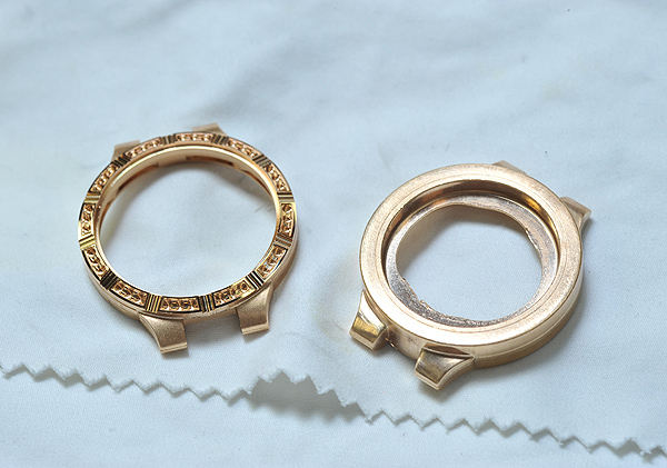 這就是完成切割與鑽孔的錶殼,是由上述的金錠所製作出來。