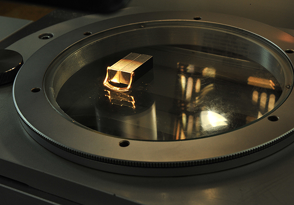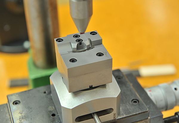 上述的工具是在錶扣的背面,印壓上PIAGET字樣的機台。接下來透過投影機,來檢查錶扣的製作是否符合規格。