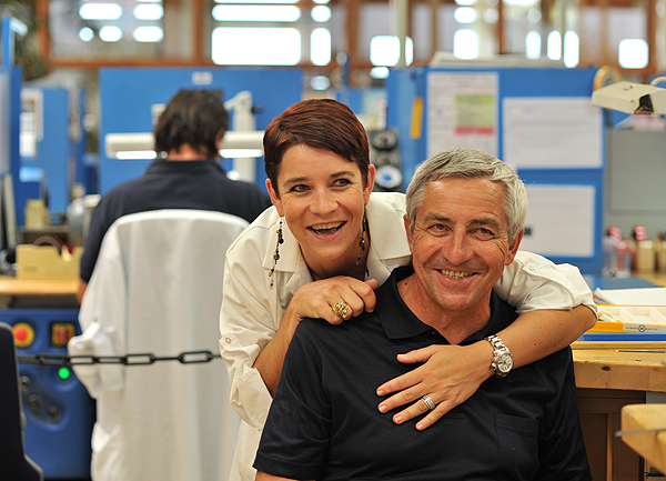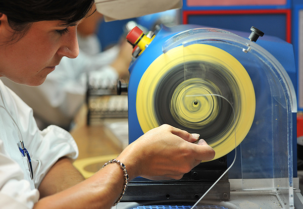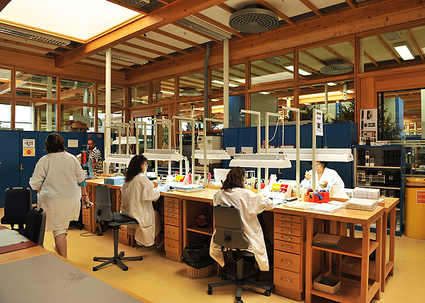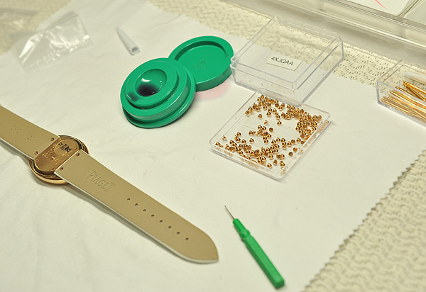 在珠寶製造部門的隔壁,是負責鑲嵌鑽石的部門,其工作包括將鑽石鑲嵌於面盤、錶殼與鍊帶之上。透過顯微鏡的輔助,製錶師將鑽石放入面盤上的寶石孔,並且以手工具在周圍刻鑿出四個勾爪,接著以特殊工具,將四個勾爪表面修飾得圓滑光亮。同樣的動作要進行上百次之多,所以需要耐心與卓越的技術,方能完成每一個鑲嵌的步驟。