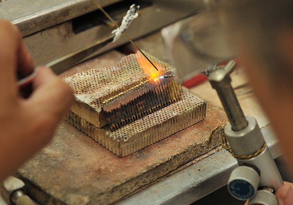 在這裡,製錶師以高溫焊接的方式,製造編織式的K金鍊帶。現在生產這種鍊帶的錶廠,已經不多,其服貼柔軟的設計,令人印像深刻。