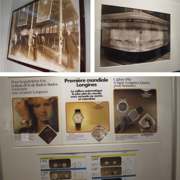 史料室的時間軸上,除了以錶款畫出浪琴的歷史,當還會有許多古老的新聞資料,左上圖是浪琴所發明的賽跑計時機制,相當精準。不過,在這種地方跑步,應該不太愉快。右上則是浪琴首度參加BASEL鐘錶展時的BOOTH,如今看來更彌足珍貴了。而下面則是浪琴的古早廣告圖片。相當古意盎然。