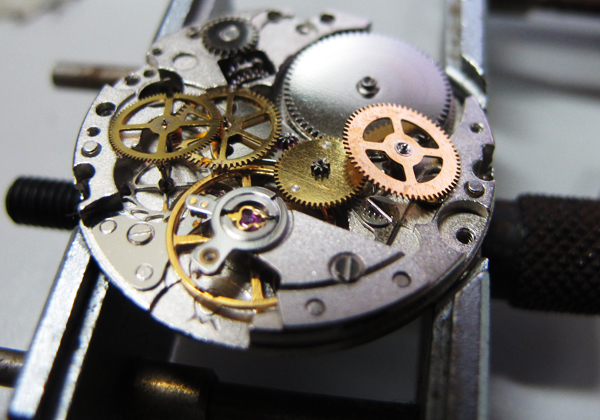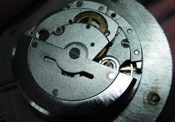 卸下自動盤後,可以看到機芯的零件,零件本身的品質不是太好,而重點是螺絲的溝槽相當的淺,表示這機芯其實沒有打算讓人日後維修拆裝的準備。的確也是,如果不是出於被騙分不出真假的狀況,誰會拿一支假表去維修呢?