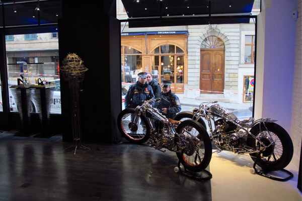 落地窗是相當醒目的櫥窗位置,MB&F在此放了兩台造型特殊的重型機車,對!這也是Max喜歡的作品。比起腕錶,看來這大傢伙更能引人注目。