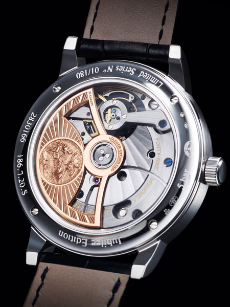 功能:時、分顯示,小秒針顯示位於飛行陀飛輪上/萬年曆日期、星期、月份、年份以及月相顯示