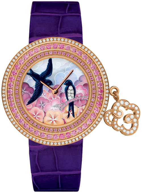 此象徵春回大地的腕錶描摹了一對優雅矯健的燕子。在歐洲,相傳燕子會為所築巢棲息的屋舍帶來好運。Van Cleef & Arpels 梵克雅寶在透過這款腕錶重溫了兩大經典主題:一雙比翼齊飛的飛鳥象徵矢志不渝的愛情,以及1920年代起成為Van Cleef & Arpels梵克雅寶特色設計的燕子。此外,更有雲狀幸運吊飾輕輕飄過錶盤。