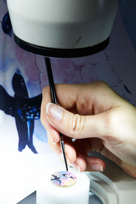 Charms Extraordinaire Hirondelles腕錶以漸變色彩為主。在藍、粉與淡紫交融的背景下,燕子雙雙站在枝頭。這片美麗的背景同樣是工匠精心描繪的珍珠母貝微雕,燕子胸前、樹枝和腕錶外圈均鑲嵌鑽石和粉紅及紫色藍寶石,以呼應豔麗的花兒和彩雲。
