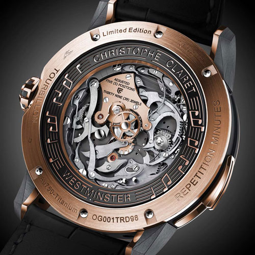 陀飛輪位於6點鐘位置,由分層板橋固定,採用鏤空設計。這是Claret表廠的經典之作,打破多年來實驗室的所有測試紀錄,振動頻率為3赫茲(每小時21, 600次)。手動上弦機芯由雙發條盒提供能量,動力儲存可達72小時。