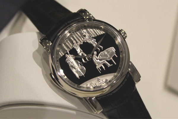 ULYSSE NARDIN的金雕活動人偶總能讓人愛不釋手,今年發表全新設計JAZZ三問活動人偶腕錶,當啟動三問時,鋼琴師會將雙手舉起,指示樂團演奏。九點位置的Double bass負責報小時,12點鐘位置的小號與薩克斯風手則交織出刻,最後由薩克斯風手獨奏出分鐘,完畢後鋼琴手會將手放下,表示結束,過程流暢有趣,限量18只。