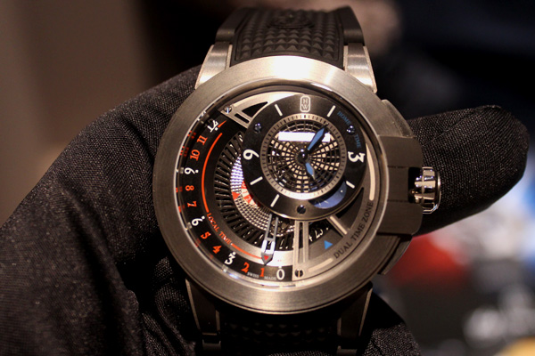 鑽石之王HARRY WINSTON的鑽石與珠寶錶很厲害,今年發表諸多珠寶錶其鑲嵌工藝非常美妙,並結合珍珠母貝拼貼與琺瑯等工藝建構出美善,但這部份請容日後再報。我們先來看看品牌非常有特色以鎬合金為材質,視覺很具威脅性的Z-Project,今年出了系列第八只,發表全新兩地時間腕錶。透過單一錶冠即可調整。拉出錶冠第一段,面盤左側紅色區快的Dual Time大指針會瞬跳到最上面,使用者調整時可參考中央偏左的箭頭所指示的小數字盤調整時間。再壓入錶冠,大指針便會瞬調到所設定的時間。而錶冠拉開第三段則是調整一點鐘方向的所在地時間。By the Way,限量200只。