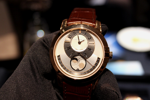 2013年,攸關HARRY WINSTON的最大消息,應該就是被SWATCH集團以十億美金收購,許多人都在觀望之後會怎樣。不過以今年觀察SWATCH集團內諸多品牌的走向,總覺得各品牌間的資源技術共享可能會成為之後的固定模式,這議題先擱著,下次站長報告有機會再來談。重點是,併購至今雙方該還在蜜月期,目前看來依舊是個可愛的互惠發展。今年品牌發表的諸多腕錶中,其中兩款全新錶款所採用的,便是由SWATCH所提供的專屬機芯,並且很有誠意的採用矽游絲。這款Midnight靜夜月相腕錶,用的便是專屬機芯,偏心時分指示,大型月相顯示,以及逆跳日期指示,看來非常搶眼。當然,細膩的作工也是一定要的。