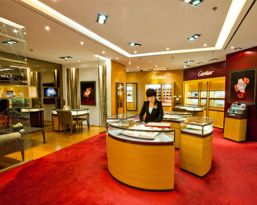 下一站我們來到金鷹國際購物中心,這間是合肥首屈一指的精品高檔百貨,地理位置在長江路、淮河路與壽春路三大主幹道交叉地帶, 4個樓層佔地7000平方公尺,主打男性高端消費,擁有許多安徽境內獨有的國際一線品牌如ARMANI、HUGO BOSS、Dunhill、Ermenegildo Zegna、MONTBLANC、VERTU、MaxMara等等。盛時表行金鷹大東門店位於商場一樓入口處,有歐米茄、卡地亞、雷達、浪琴4個品牌;其中,OMEGA以旗艦店規格設置,CATIER則是安徽唯一的旗艦店,以綜合店形態經營,銷售手錶、皮具、香水、眼鏡和文具等等商品。