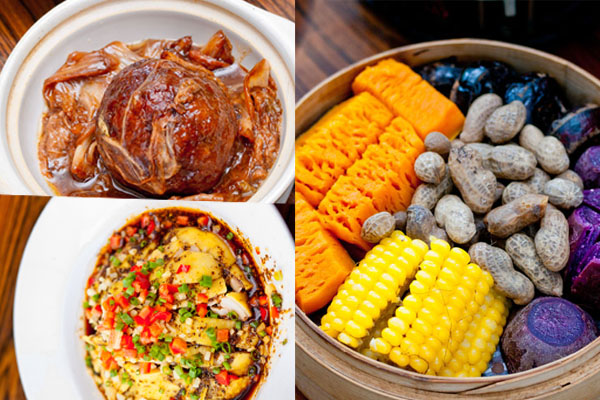 店內餐點以徽菜為主,特色菜如晚香獅子頭,色、香、味俱濃,肉質綿密可口;干鍋鮮筍絲亦是一絕,曬過的筍絲脆彈有嚼勁,以醬料爆炒之後再放上燒鍋上桌,吃起來麻辣焦香非常下飯;五穀豐登則是隨選節令穀類果實如玉米、花生、南瓜、山藥、荸薺等等,以竹製蒸籠蒸出香味,令人感受農民辛勞收穫的豐美。
