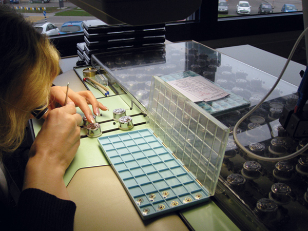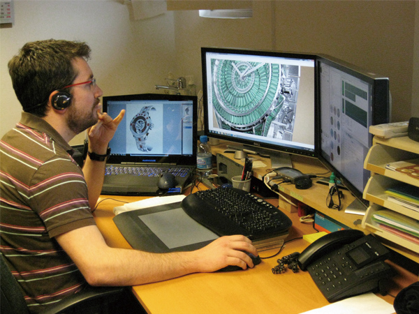 位於二樓的研發與設計部門,大約有四到五位年輕的工程師,將錶廠提供的錶款圖片與數據規格,輸入電腦之中,並以CAD軟體來設計運算,便能精確的推算出如何切割錶殼、錶圈,以及每個寶石的尺寸與克拉數。之後,便由位於地下室的CNC電腦加工母機,切割所需的錶殼結構。同時間,位於一樓的珠寶部門,也將來自全球各地的珠寶與鑽石,進行切割與拋光的手續。