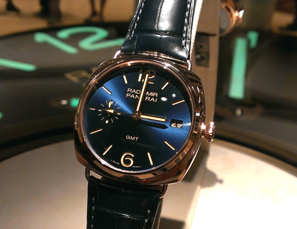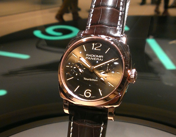 這是陀飛輪功能首次運用在Radiomir 1940系列之中,沒想到搭配棕色緞面放射紋的面盤,卻出乎意料的好看。面盤中央具有兩地時間指針,而三點鐘位置的是日夜指示盤。本款腕錶限量30只。
