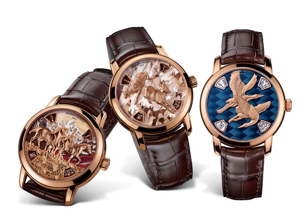 本次Métiers dArt藝術大師的三款全新腕錶,同樣配備2460 G4自動機芯和無指針式錶盤,折射出獨特的自然野趣。其中,最左側的錶款,主題是金質野駿馬,以木紋鑲嵌細工背景,然後以手工雕刻出18K紅金材質的駿馬。而中間的錶款, 主題是阿爾卑斯山上的岩羚羊,採用的工法與前者相同。至於右側錶款,則採用較特殊的手工機刻雕花面盤,再填入半透明的大明火琺瑯,最後再加上手工雕刻的粉紅金材質仙鶴。上述的三款腕錶,皆限量生產1只。