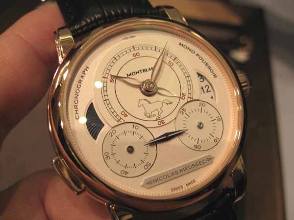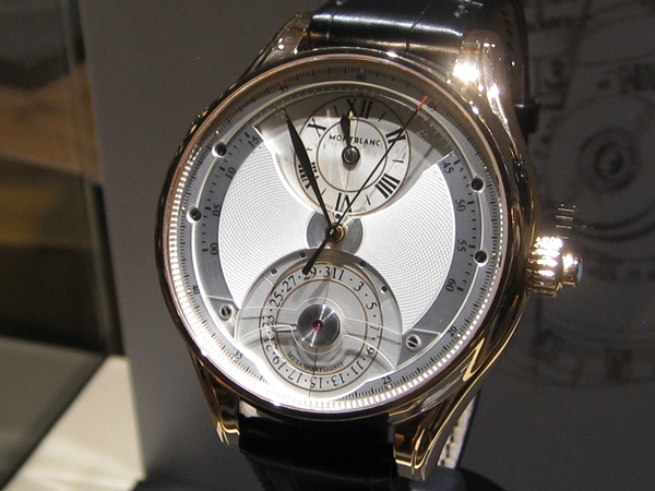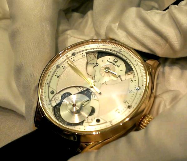 這款腕錶具有藍色緞面放射紋的面盤,搭配紅金材質非常好看,是展場中最吸引人的錶款。錶款具有兩地時間指針與日期功能,防水50米,限量發行200只。