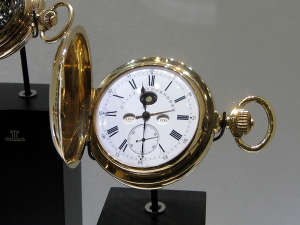 本次的錶展中,積家展場除了展示部分機芯之外(以玻璃牆的形式),也同時在展示櫃放置多款不同功能懷錶。其中本款懷錶的日期指針採用逆跳設計,日後也出 現在其他品牌的萬年曆錶款中。