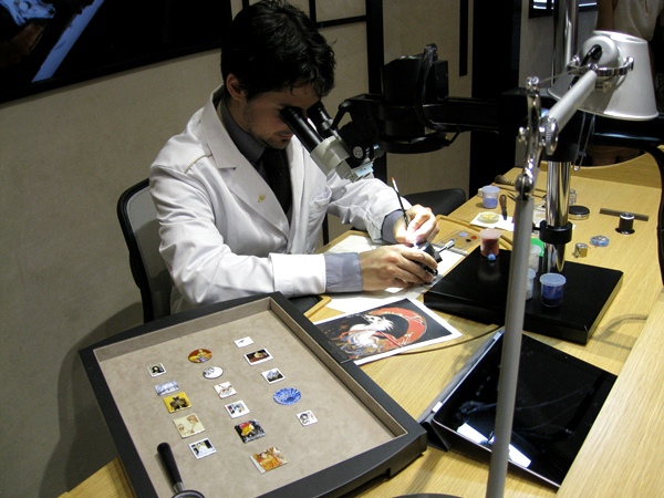現場還有琺瑯彩繪師展示繪製面盤的步驟,旁邊有許多半成品面盤,具有魔幻風格的主題,十分少見。