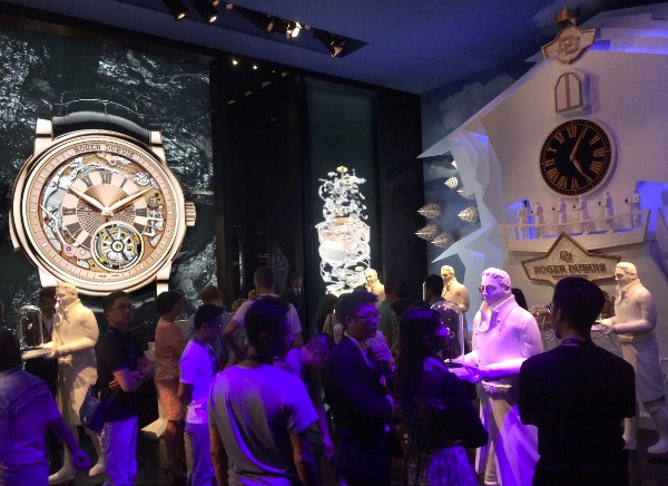 這次活動的展場空間,羅杰杜彼同樣結合具機械美感和蒸汽龐克時代的創作靈感,左側圖片是Hommage三問陀飛輪自動腕錶,右側的展場空間,則放置三款最新的女錶。中間標誌性的咕咕鐘(布穀鳥自鳴鐘),以多種機器設備配搭一群製錶匠雕像。