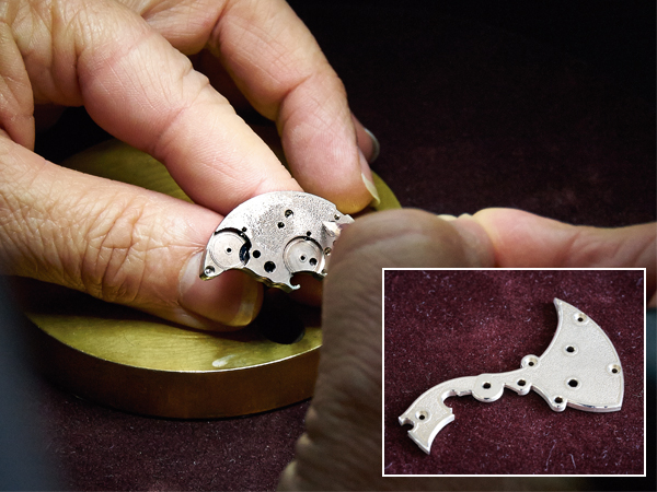 正因為筒狀、球狀游絲的形狀特異,故只能以手工捲繞製作,實在非得眼見才得以相信,一條僅頭髮1/4直徑、小於2mm的垂直高度是以純人手完成。積家廠內僅有一位資深女性工匠可擔任此項工作,她從事游絲製作已有十八年的時間,她表示,比起筒狀游絲,球狀游絲會分別向上、向下縮減,故每層游絲之間的間隔沒有規則可循,但是會先以電腦模擬出最佳的形狀俯視圖,所以她必須倚賴自己的手感,先夾住游絲尾端,再來慢慢的一層一層捲出正確的線條,需要四至五個工時才能完成一條,其中最難的便是兩端向內收入的末端曲線。
