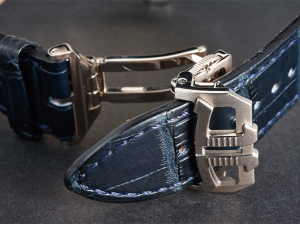 球體陀飛輪3號的視覺中心,就是六點鐘位置、360度旋轉的球體陀飛輪裝置,加上積家將正面的陀飛輪錶橋取消,所以讓球體陀飛輪的視覺更形開闊,看起來像是在漂浮的旋轉方式,同時內部的藍色球狀游絲亦形醒目,一縮一放的運作之間,簡直讓人看傻了眼。