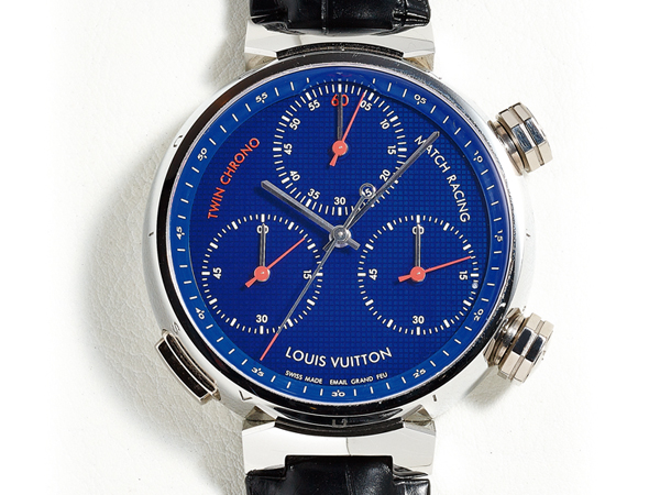 2013年LV推出的這款Tambour Twin Chrono,絕對足以名留高級製錶歷史,因為它是唯一達成雙追針計時碼錶、還能追分追秒,甚至同時計算兩個運動物體,更加上計算兩個物體到達終點之間的時間差距。尤其它的操作也非常簡單,僅僅使用一個按把(錶殼左側),以四次循環來計時:包括第一次按下啟動計時碼錶,左、右兩個計時秒針就同時運轉;按下第二次,左邊的計時停止、右邊的則繼續運作;再按下第三次,右邊計時停止,12點鐘的計時盤則迅速計算出兩個物體之間的差距;按下第四次,所有計時指針全部歸零。